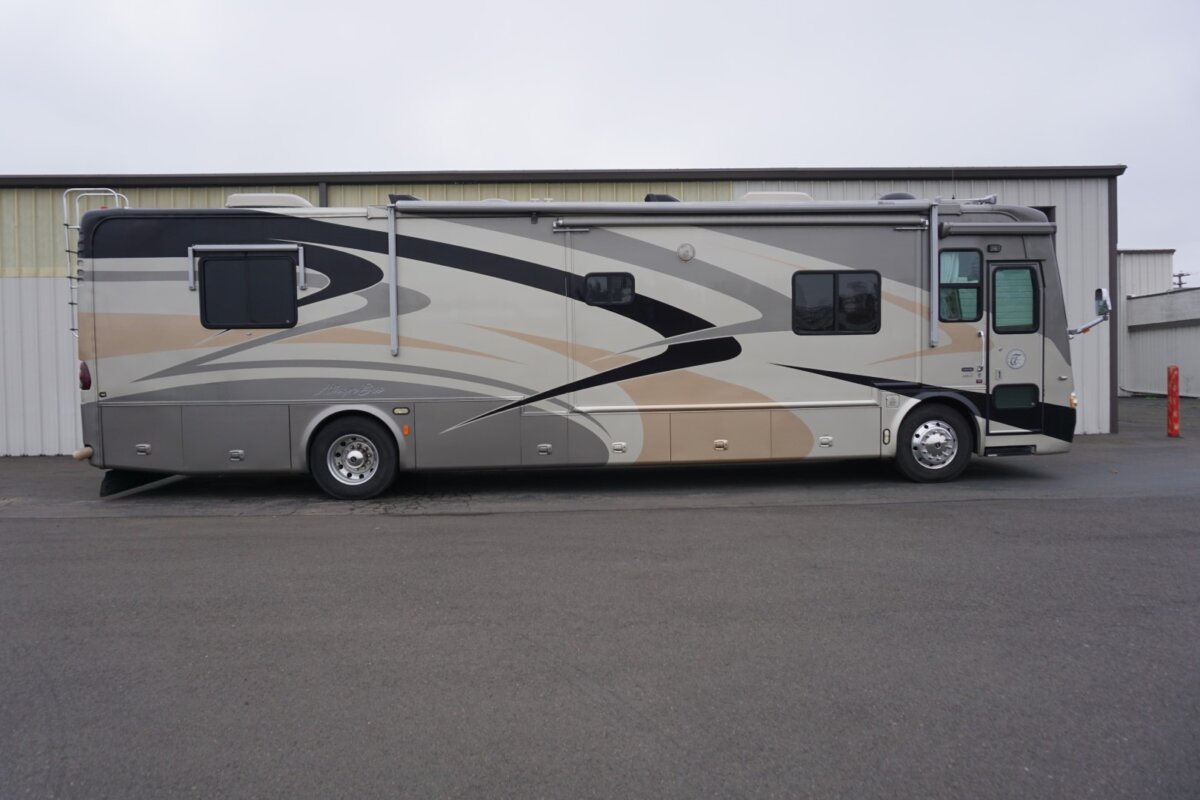 This coach is on the Freightliner chassis with a 400 ISL Cummins and 6 speed 4000 Allison transmission.  This is a driving coach with lots of power getting up the hills.  The tires are late 2024 and the batteries are also 2024.   The Residential refrigerator was done recently and the TVs have also been updated.  Generator is a 7.5 Onan with only 997 hours. You will have a hard time finding one as clean as this one is.